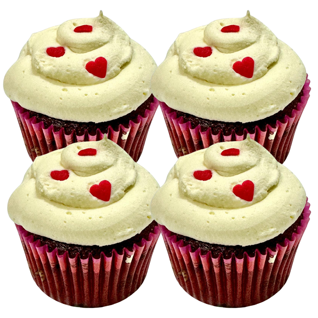 Indulge in our set of vegan red velvet cupcakes topped with irresistible cream cheese frosting.