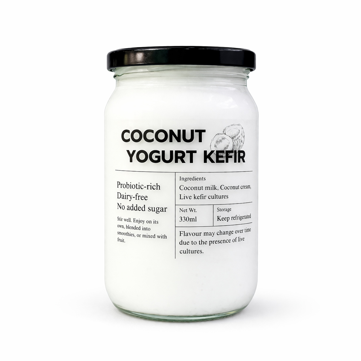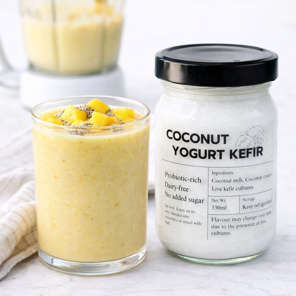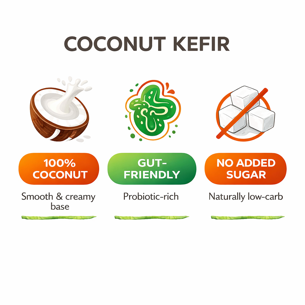 A smooth, creamy coconut yogurt kefir with a gentle tang and naturally refreshing finish. Made from pure coconut milk and live kefir cultures with no added sugar, it delivers a rich, cultured texture that feels light yet satisfying while supporting gut health and digestion.