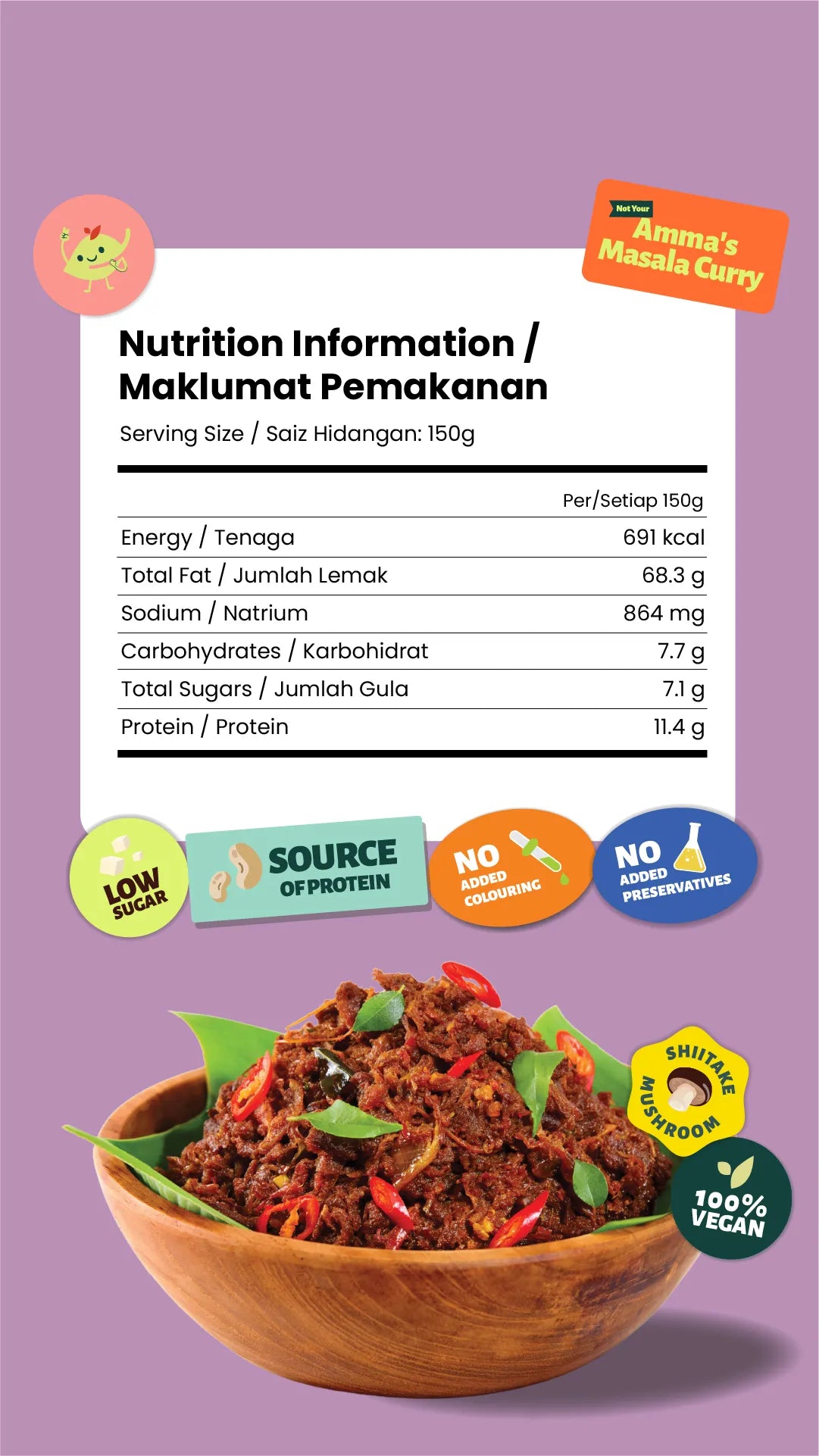 Ingredients: Shiitake Mushrooms (15%), Water, Isolated Soy Protein, Tomato, Palm Oil, Garlic, Onion, Tapioca Flour, Soy Sauce, Coriander, Chili, Cumin, Fennel, Turmeric, Cinnamon, Cardamom, Star Anise, Nutmeg, Bay Leaf, Clove, Black Pepper, Vegan Seasoning (Salt, Sugar, Hydrolyzed Soy Protein, Hydrolyzed Corn Protein, Yeast Extract, White Pepper, Flavour Enhancer [INS 621, 364(ii), 631, 627]), Curry Leaves.